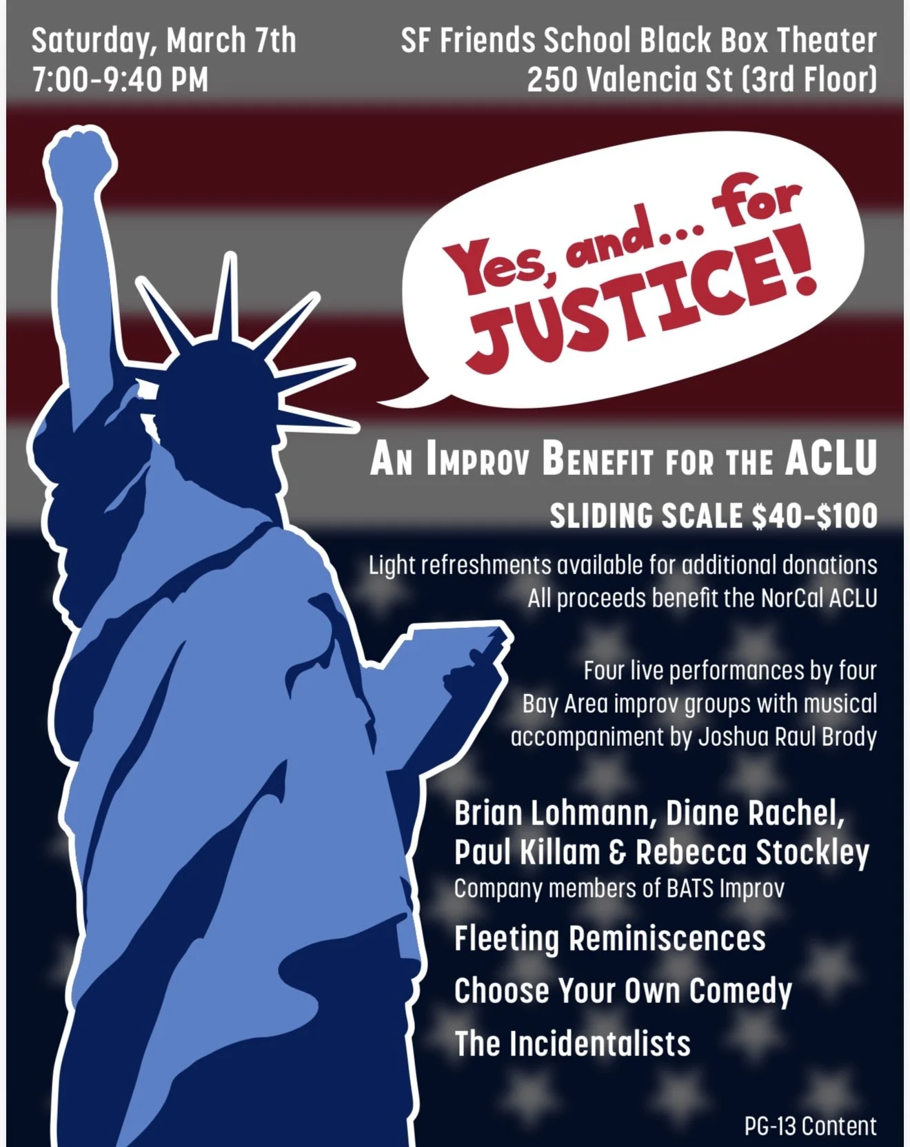 San Francisco, CA — Yes, And… for Justice unites some of the Bay Area’s most celebrated improvisors for a one-night-only benefit performance supporting the American Civil Liberties Union. The evening blends top-tier comedy with a shared commitment to civil liberties, community, and creative collaboration.